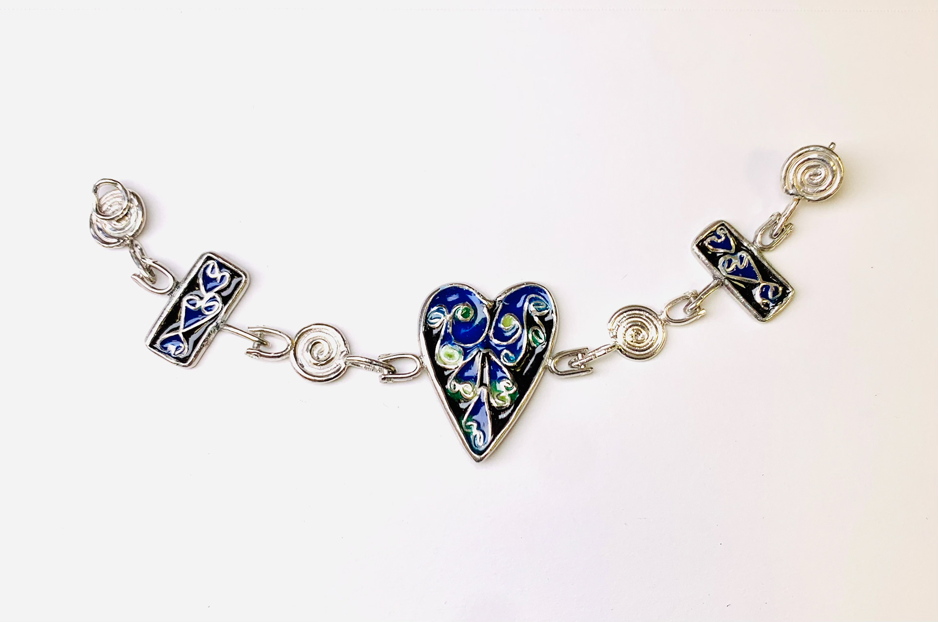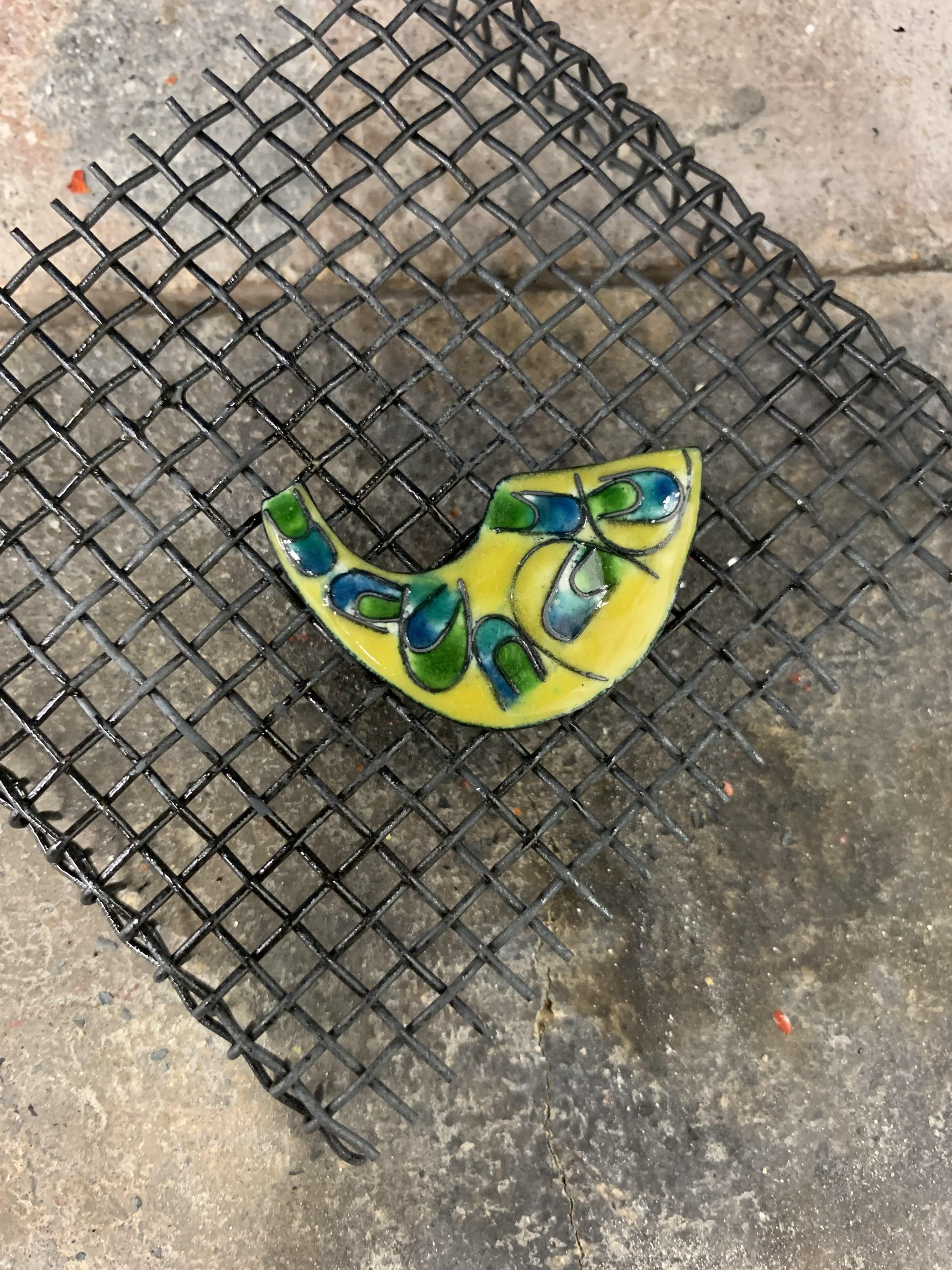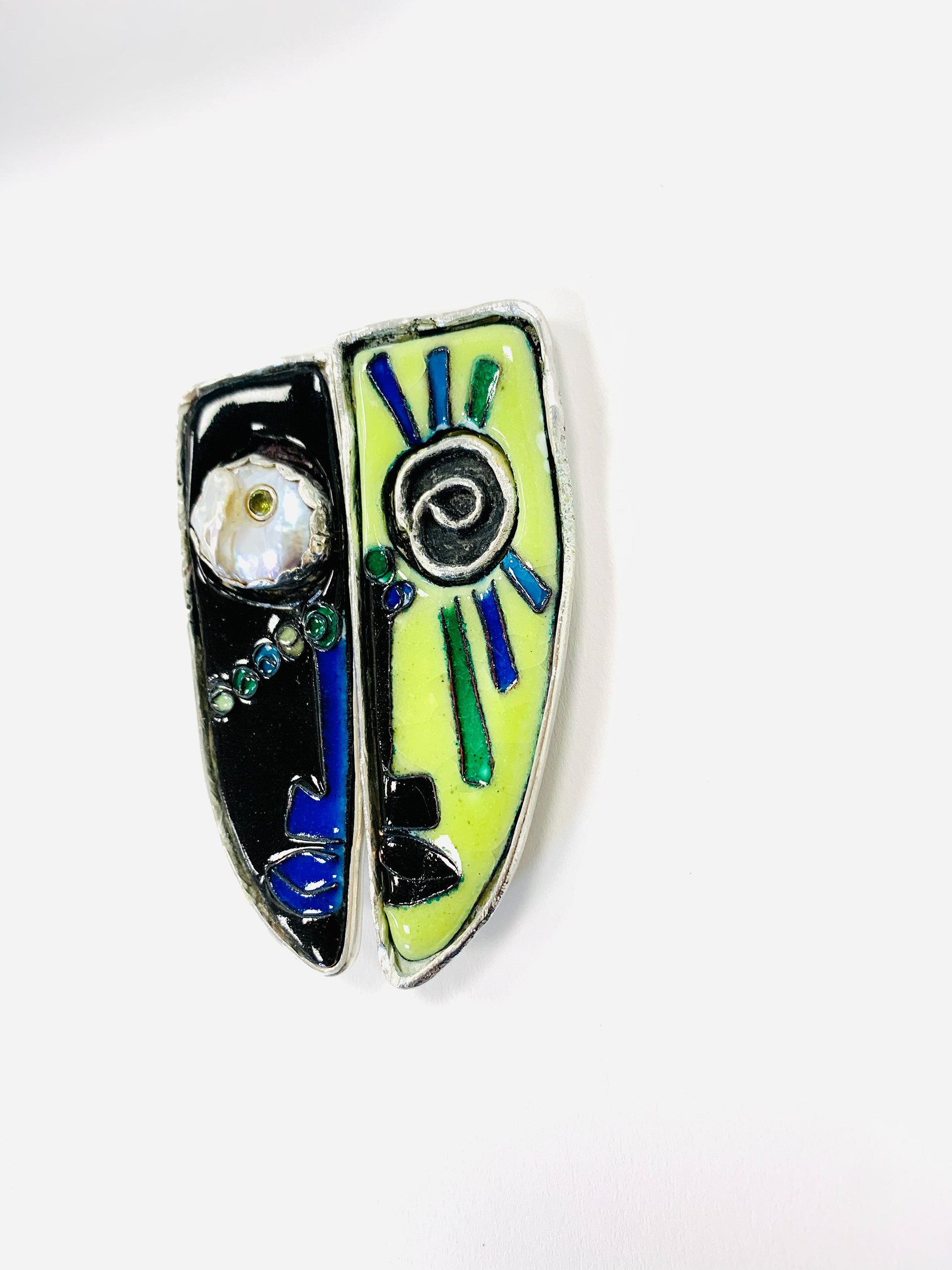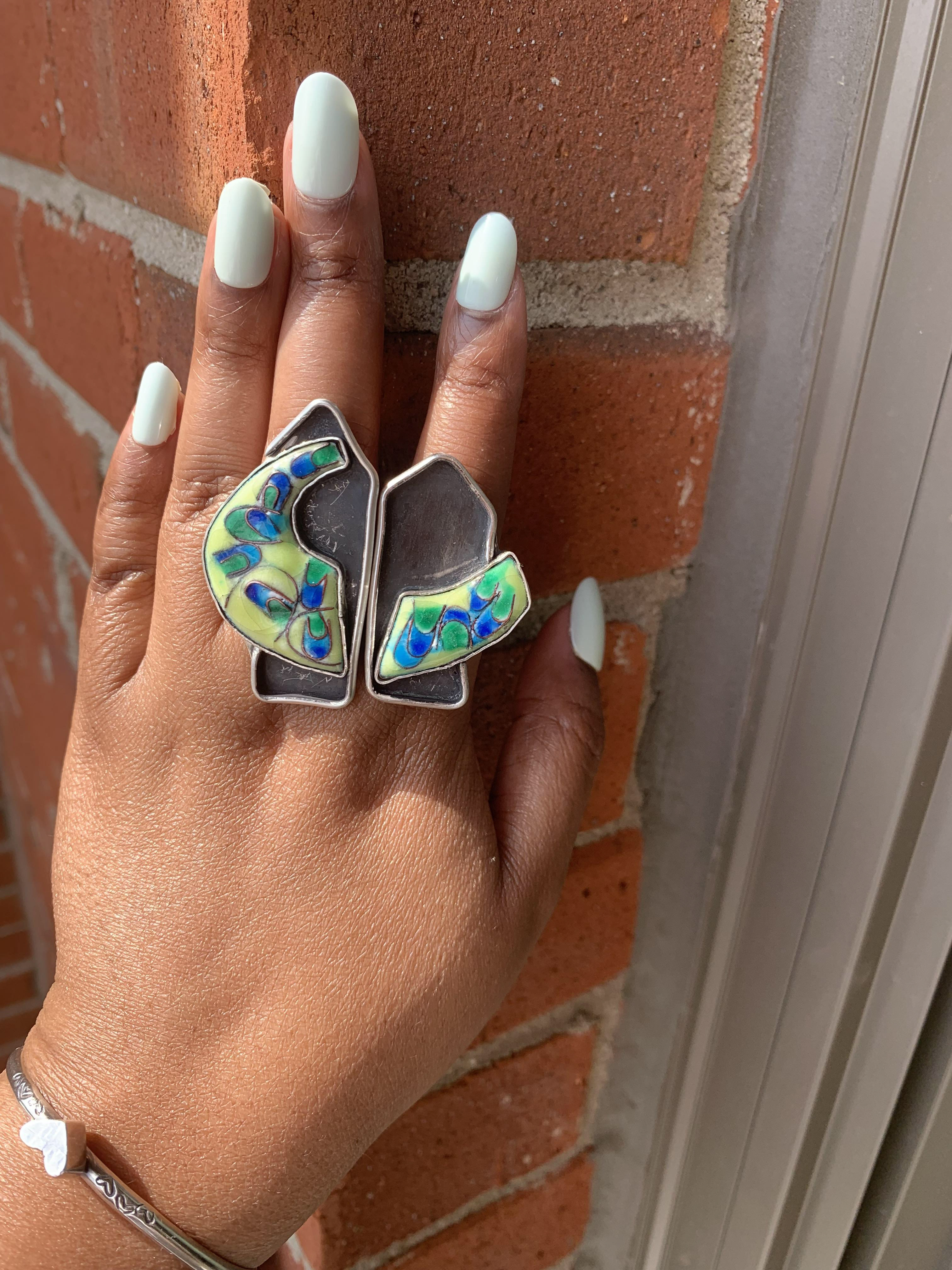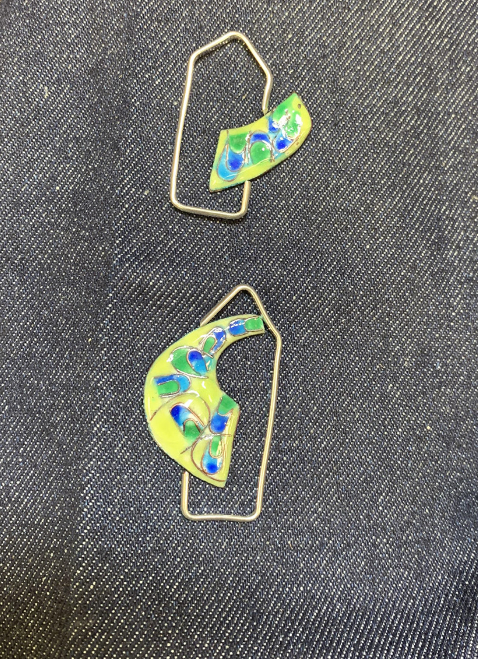 Techniques: Cloisonné and Champleve’ vitreous enameling with fine silver and copper metals.