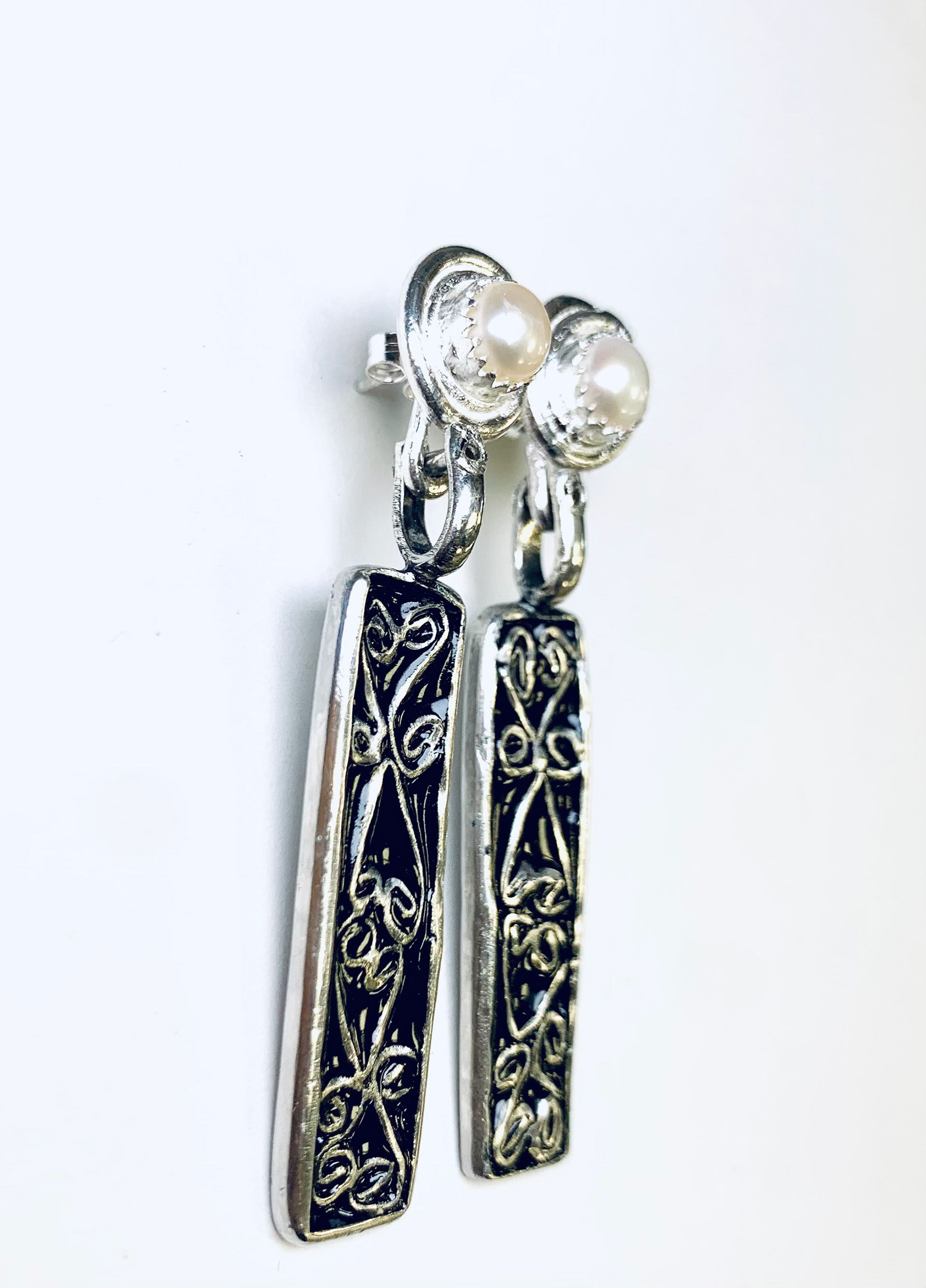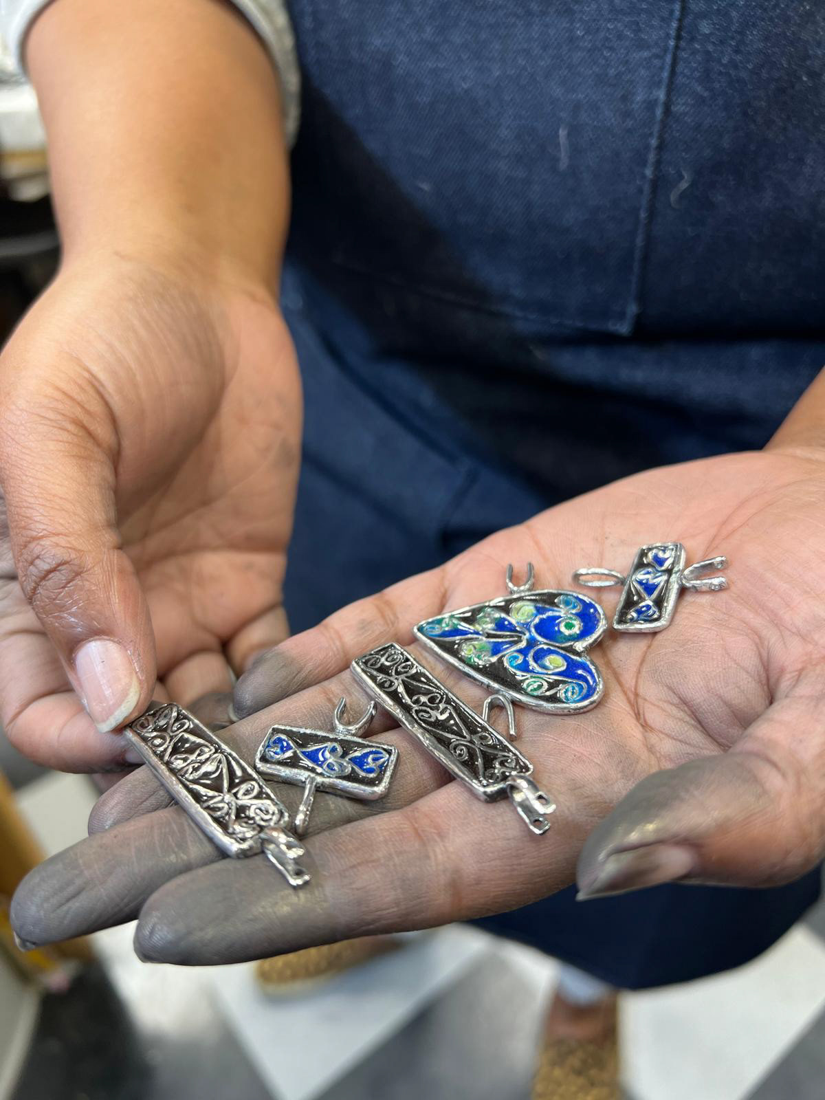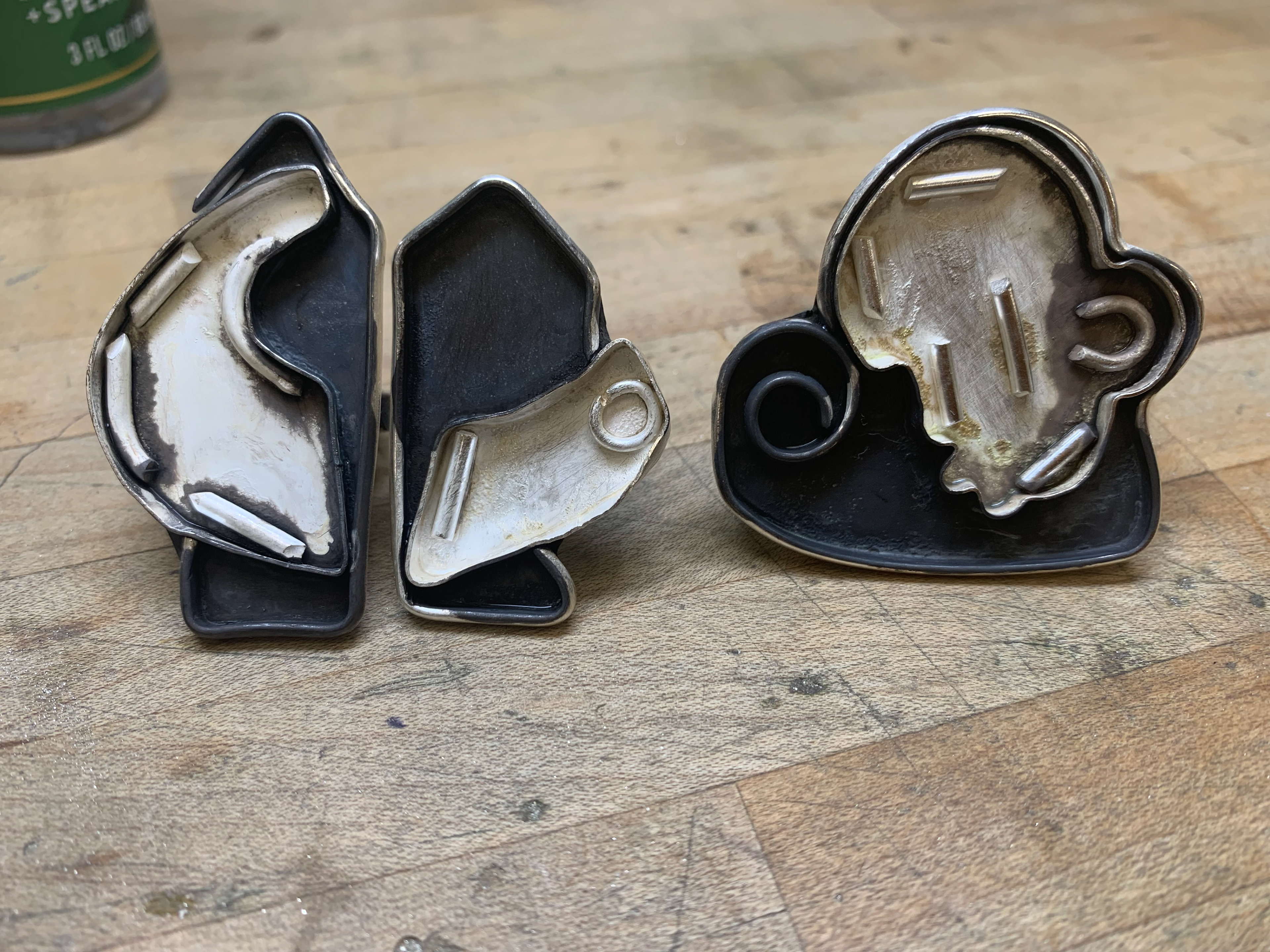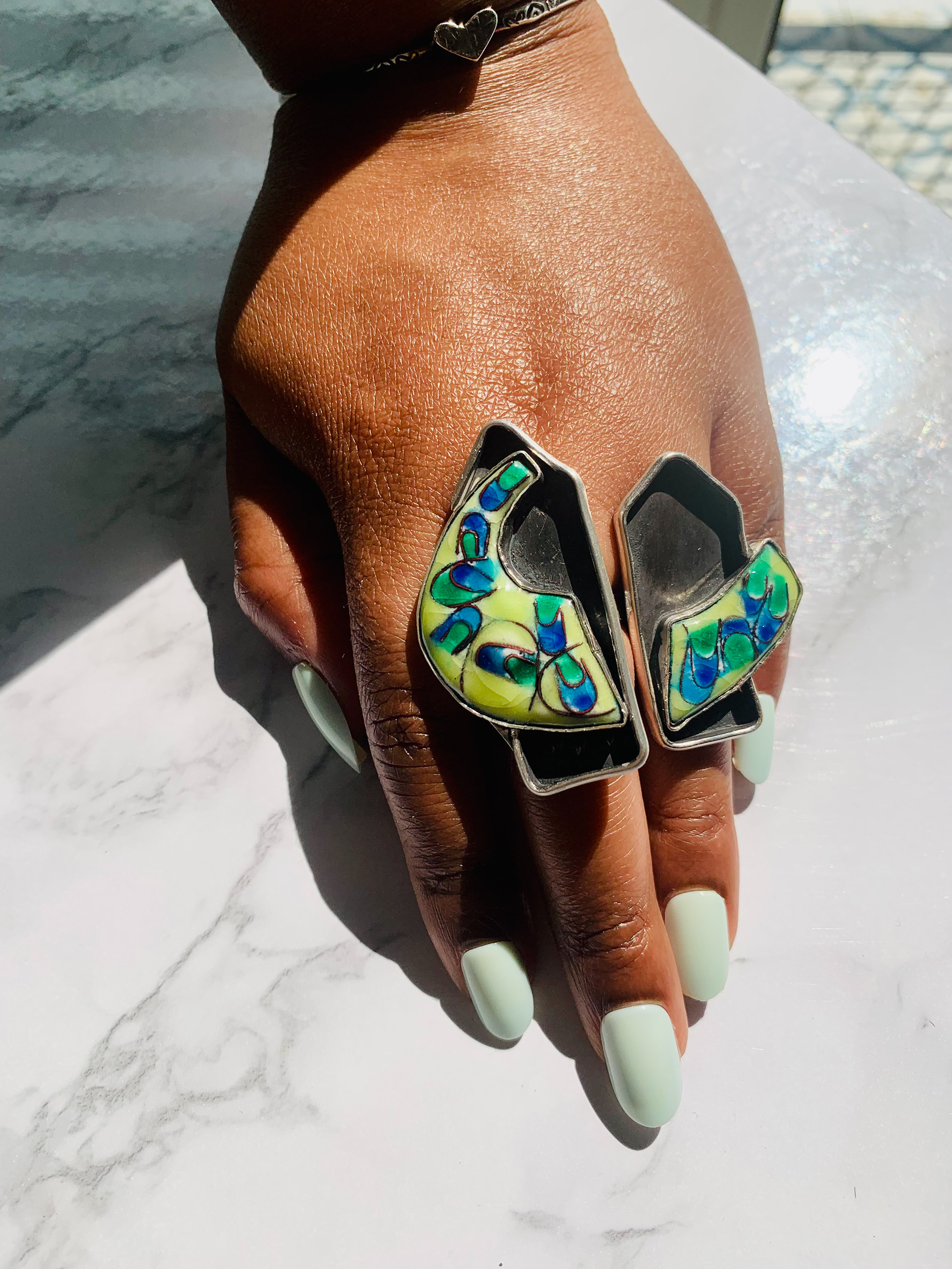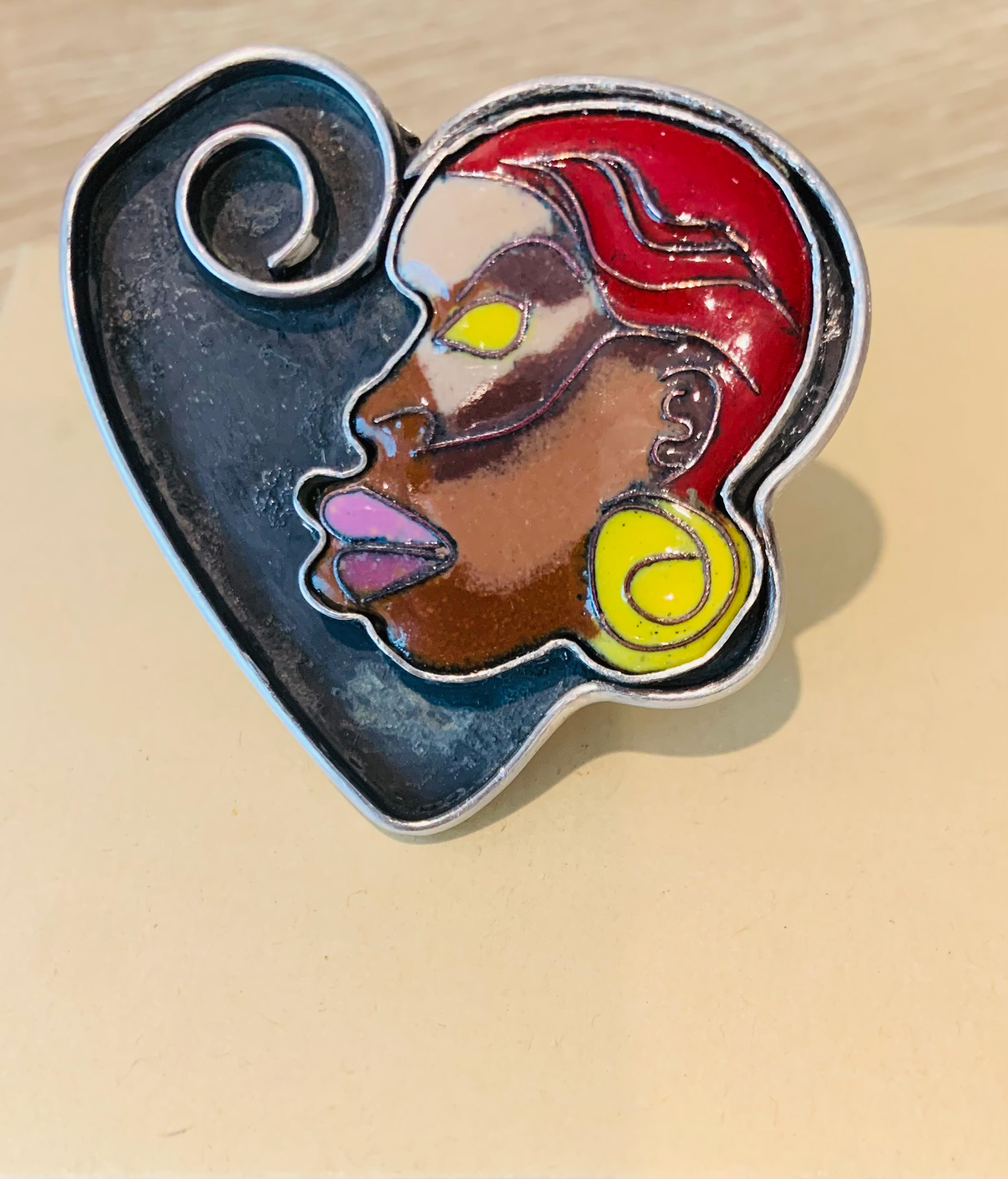 Techniques: Cloisonné and Champleve’ vitreous enameling with fine silver and copper metals.