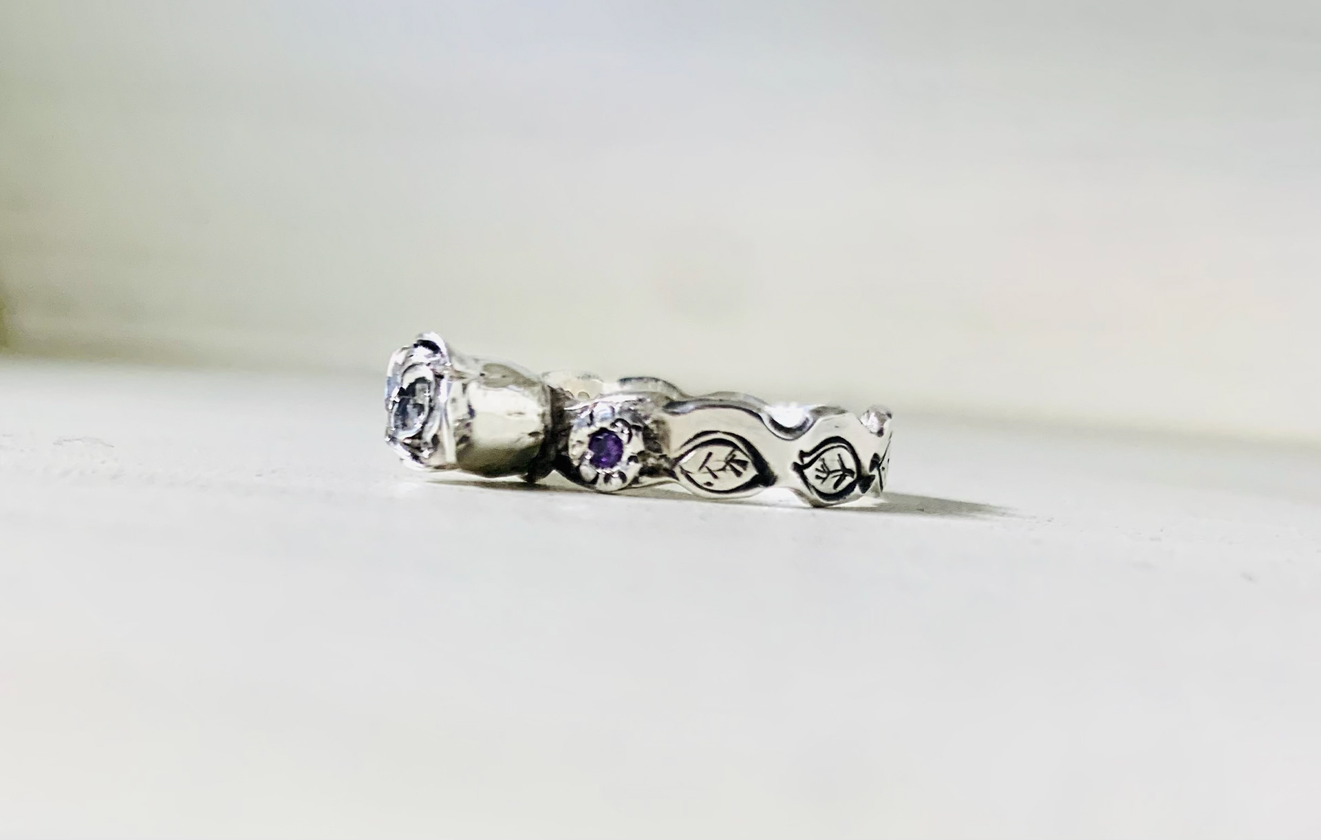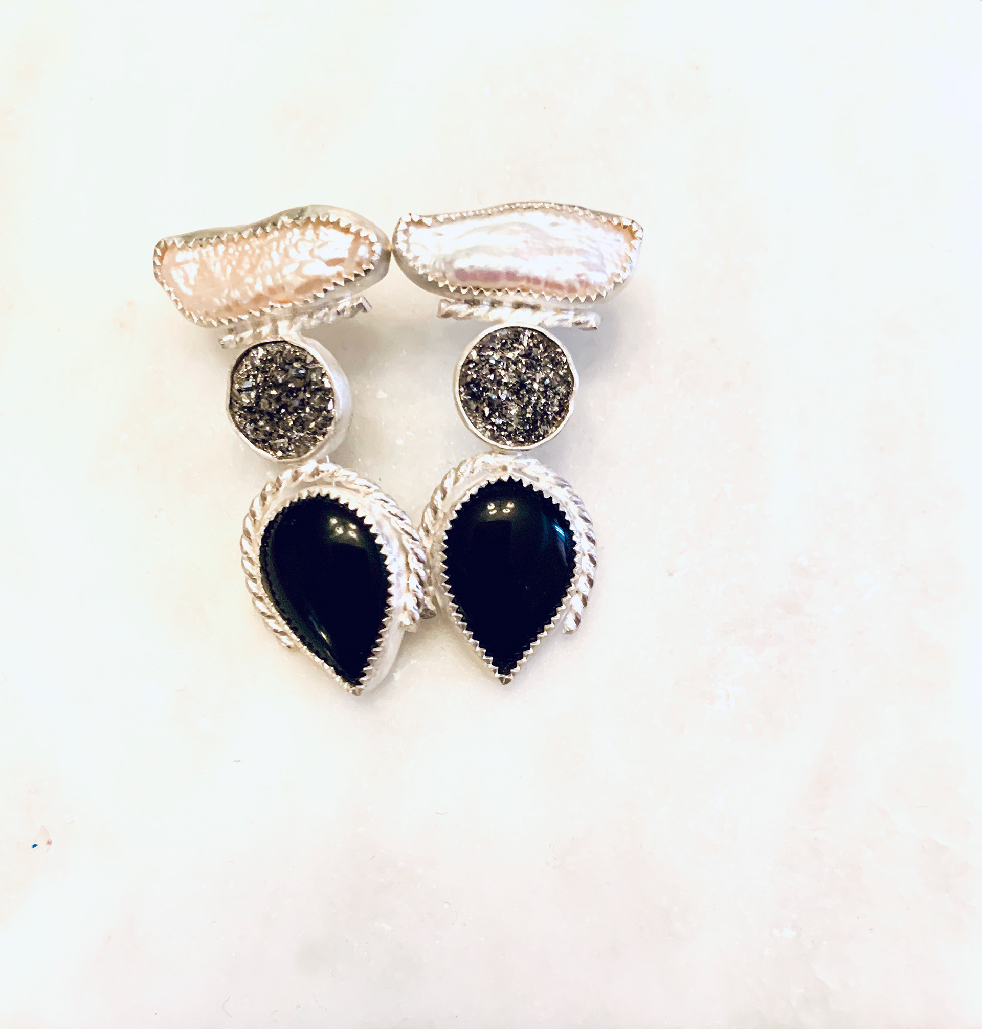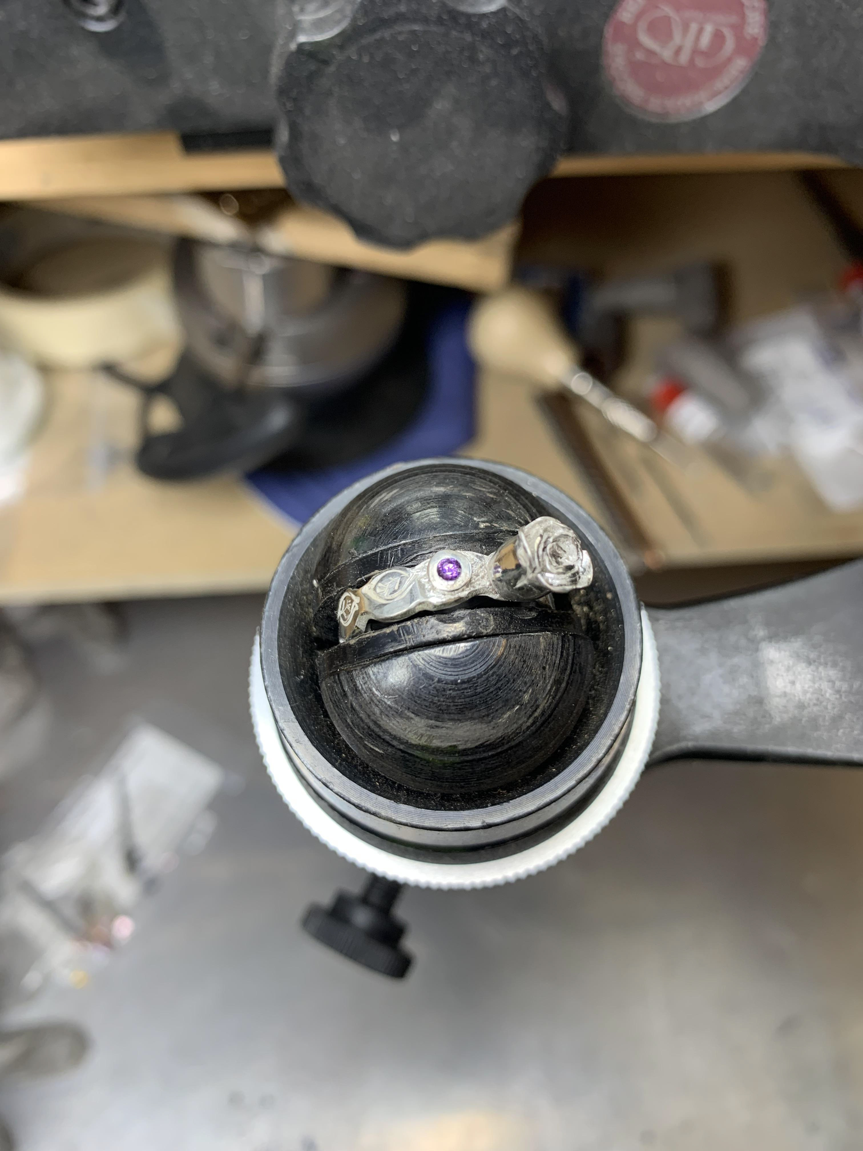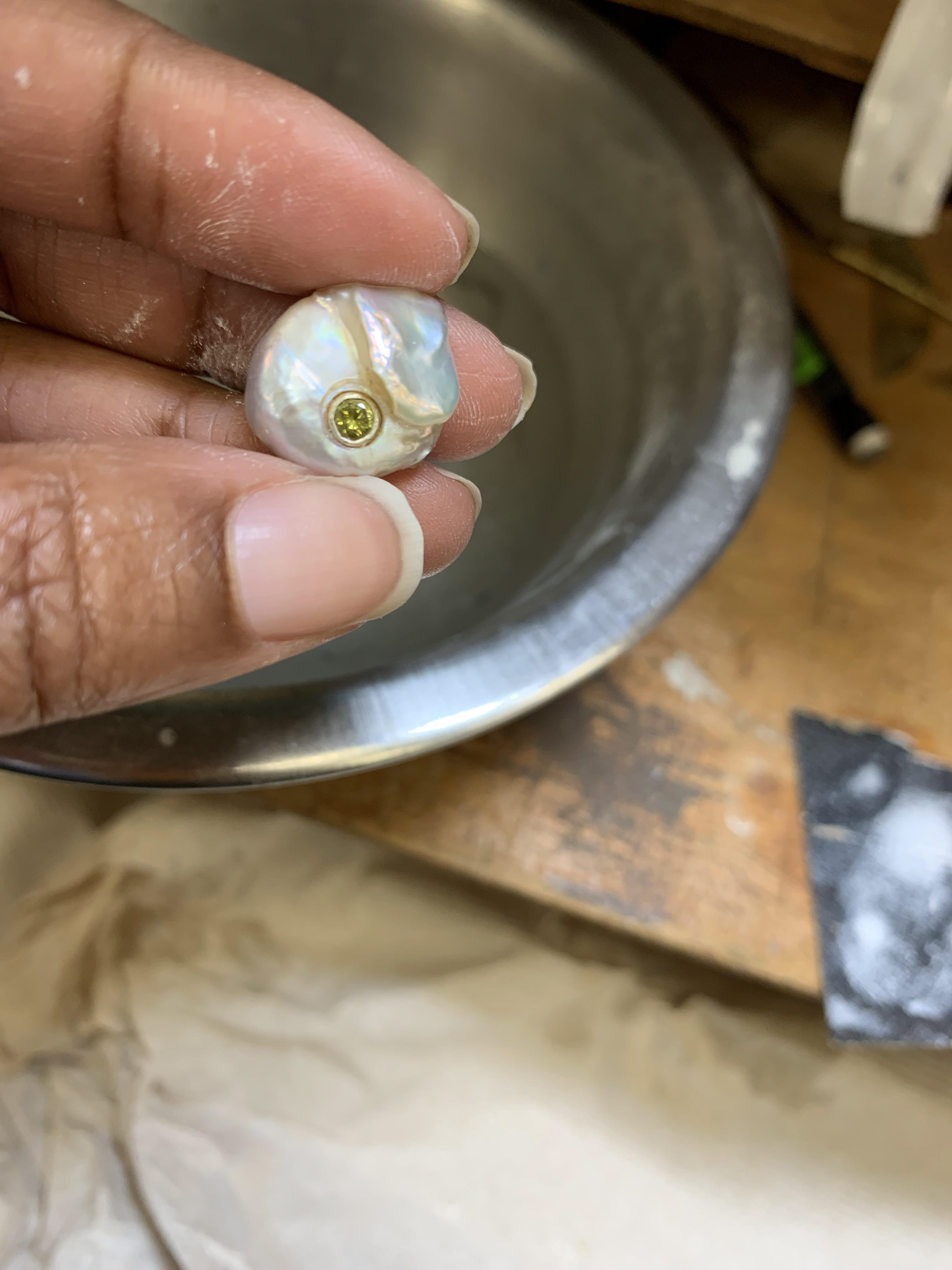 Techniques: Flush setting, tube setting, bezel setting, pearl carving and tube setting pearls.